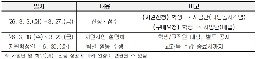 ※ '창의설계, 스마트제조활용캡스톤디자인, 캡스톤디자인' 수강학생들은 모두 해당 ※ 1. 신청기간 : 2026. 3. 3.(화) ~ 3. 27.(금) 2. 신청방법 : 참가팀별 온라인(디딤돌시스템 https://rise.pknu.ac.kr/) 신청 3. 지원내용 : 팀 단위 과제 운영을 위한 재료, 시제(작)품, 도서구입, 회의비, 국내여비 등 4. 지원규모
