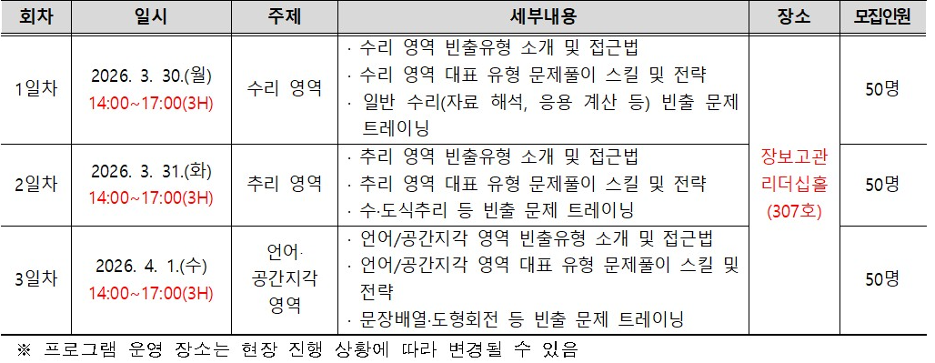2026년 상반기 대기업 취업을 준비하는 재학생에게 직무적성검사 특강을 통해 빈출 중심의 문제 유형 파악과 문제풀이 등 학습법 노하우 교육을 실시하오니, 많은 참여 바랍니다. 가. 교육내용: 상반기 대기업 문제풀이(직무적성검사) 특강 나. 지원자격: 3, 4학년 재학생 다. 신청기간: 2026. 3. 16.(월) ~ 3. 25.(수) 선착순 모집 라. 교육일정 및 장소