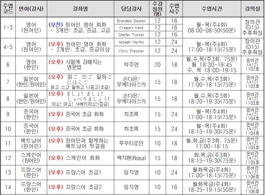 | 첨부파일 | (붙임1) 2026학년도 글로벌 언어집중강좌(GLIP) 세션1 모집 안내문(3.10).pdf (붙임2) 강의계획서.zip (붙임3) 온라인 수강신청 메뉴얼.pdf (붙임4) 글로벌언어집중강좌(GLIP) 취소 및 변경신청서.hwp | ||