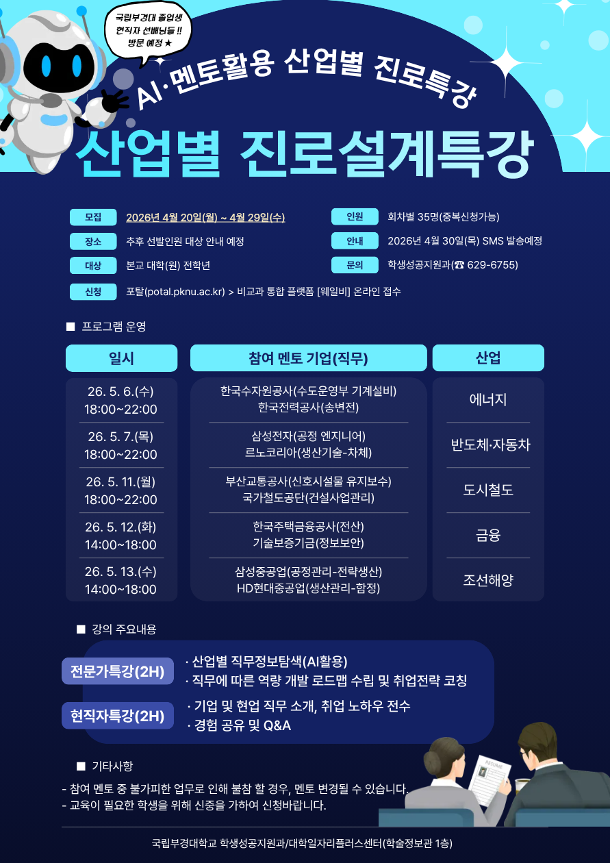 | 2026년 재학생맞춤형고용서비스사업「진로설계특강(AI·멘토 활용 산업별 진로특강)」참여자 모집 | ||||||||||||||||||||||||||