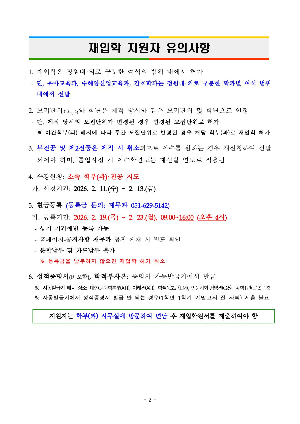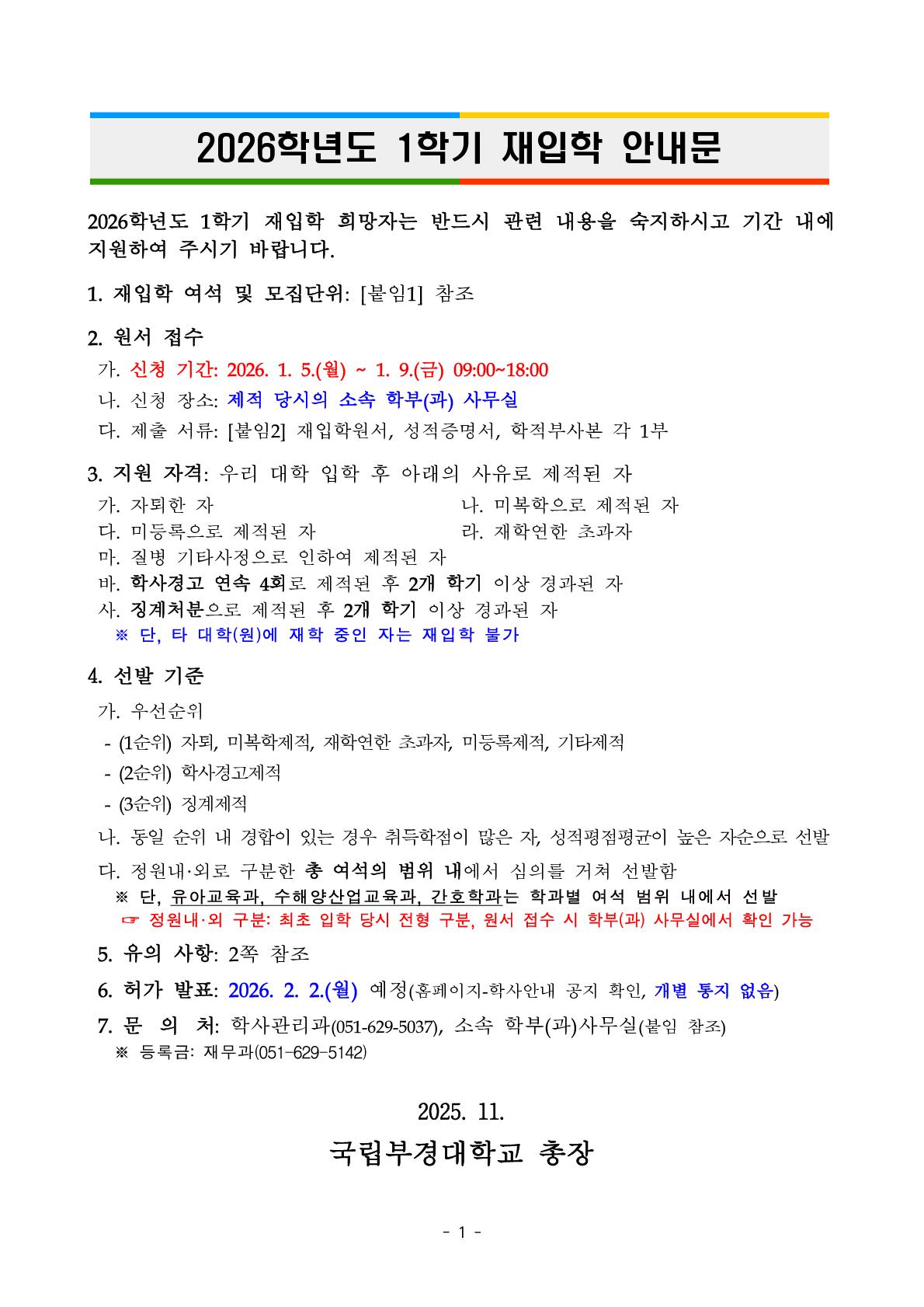 | 첨부파일 | (붙임1) 2026학년도 1학기 재입학 실시 계획(안).pdf (붙임2) 재입학 여석 및 모집단위.xlsx (붙임3) 재입학원서.hwpx (붙임4) 학부(과) 연락처.pdf (붙임5) 재입학 관련 규정.hwpx | ||